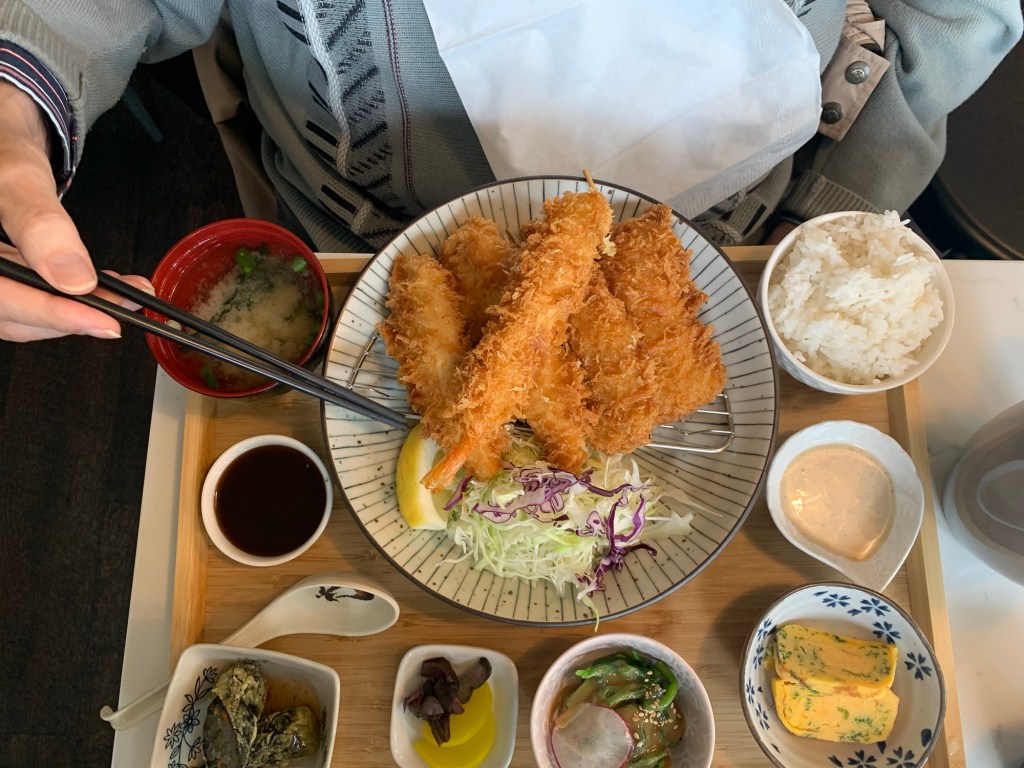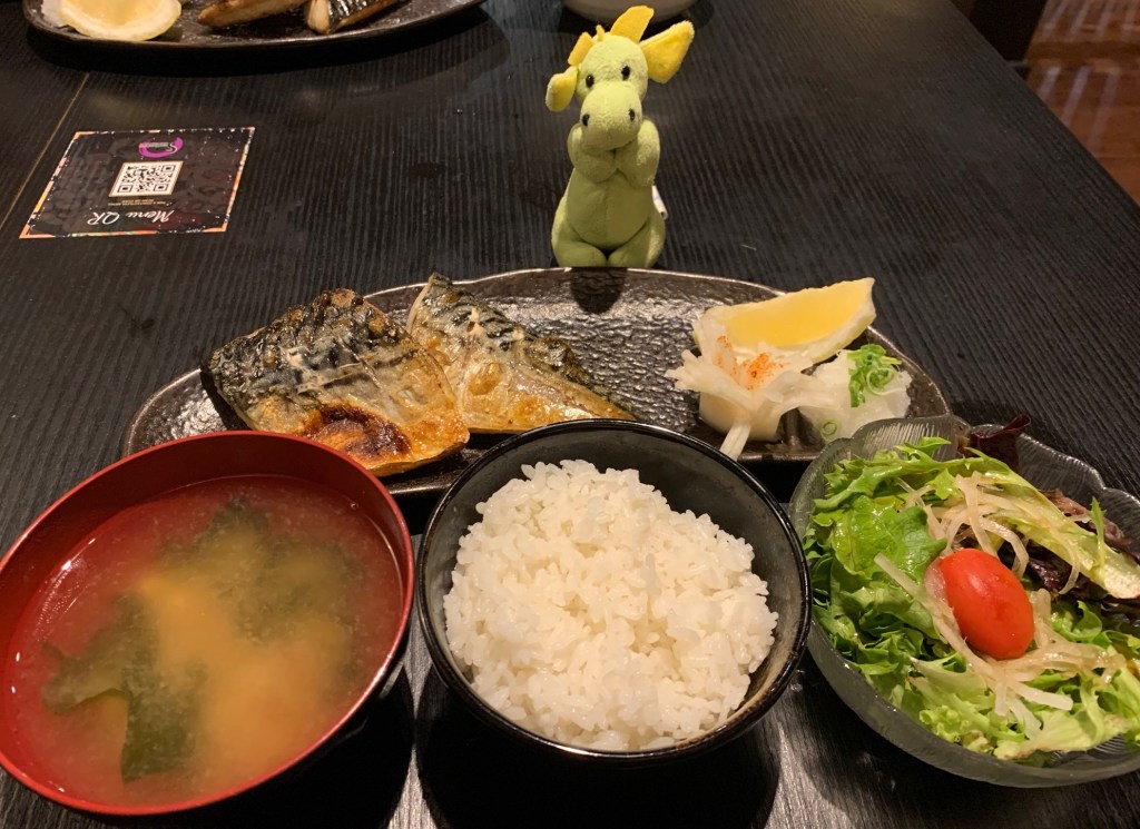 Assorted Katsu SetMackerel Set and Dragon-kun making sure the greens aren’t swimming in Gina sauce