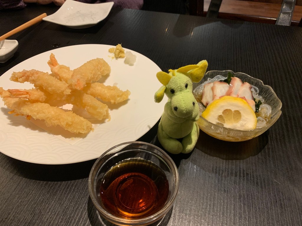 We ordered the Ebi Tempura, Ika Salad, and Grilled Saba (mackerel) Set. A bonus: unlike many other Japanese restaurants the green tea is free.