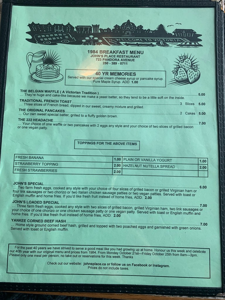 This past week was the 40th anniversary of one of Victoria’s mainstay brunch spots: John’s Place.
