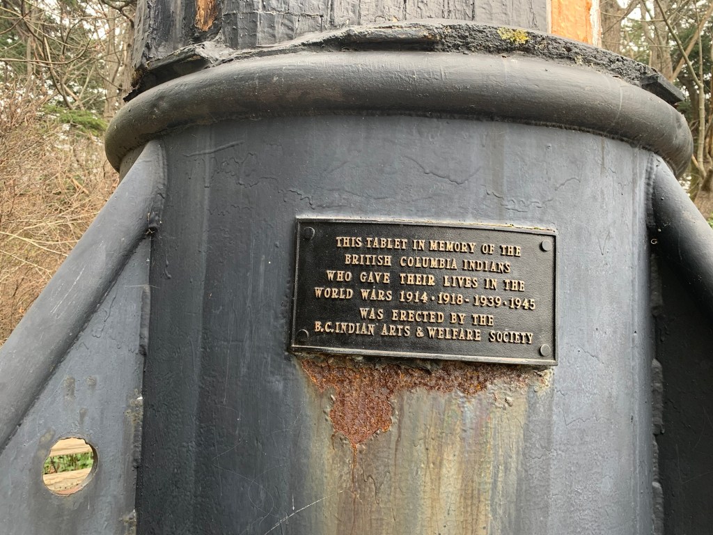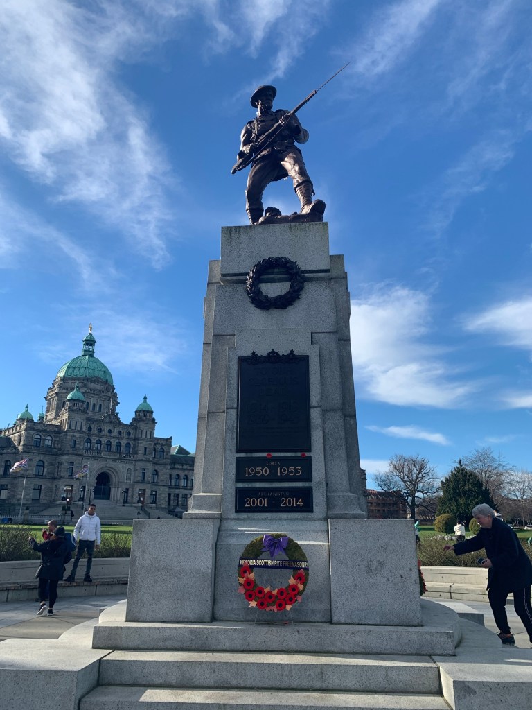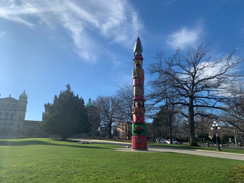 Cenotaph in front of the B. C. Parliament Statue of Queen Victoria (whom the city is named after)The Knowledge Totem Pole carved by Cicero August, a costal Salish artist, and his sons Darrell and Doug August.