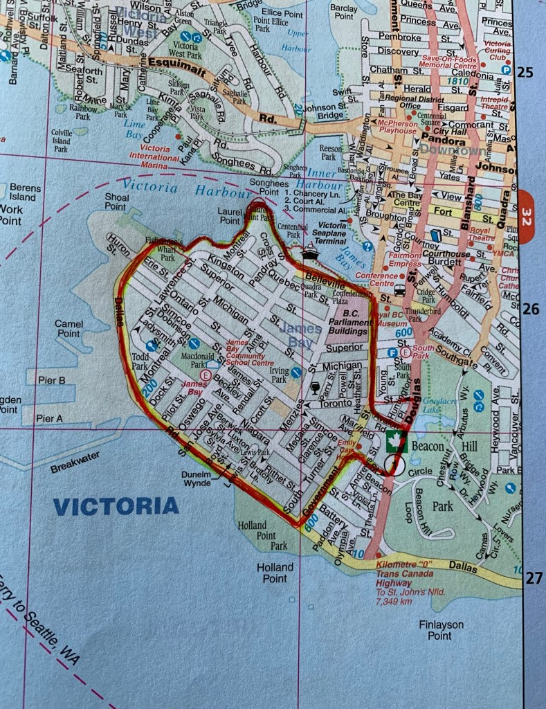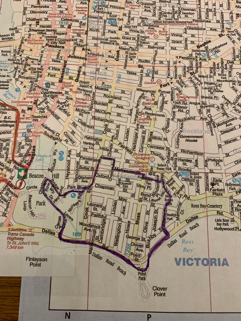 If doing this route and you need a place to park, there are parking spaces on Douglas and in Beacon Hill Park.