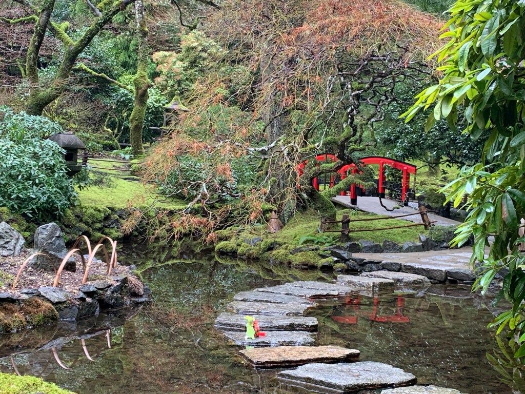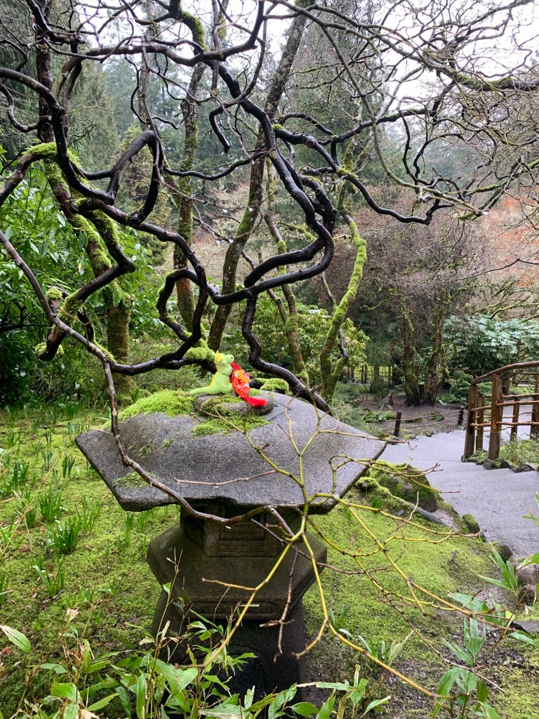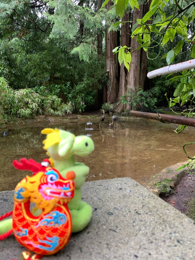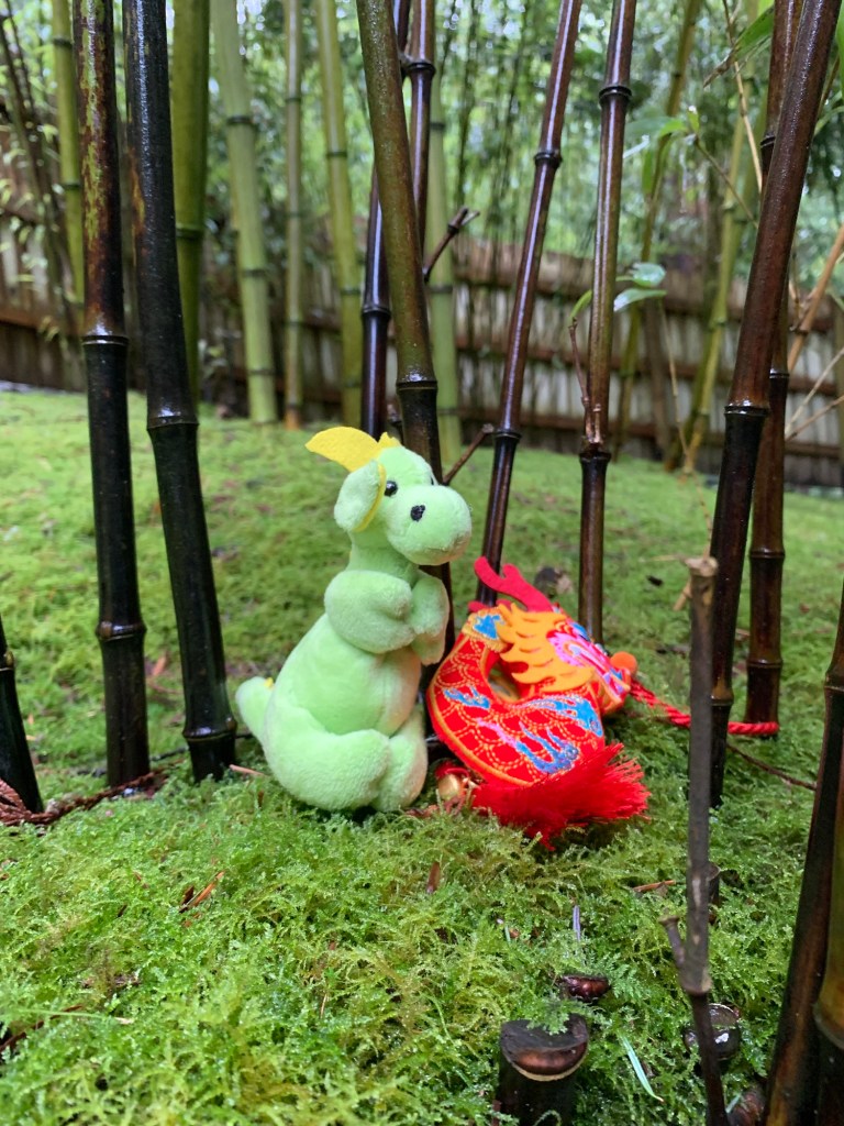 Tori gates to Japanese garden Stone lampRyuu and Dragon excited to see another dragonBamboo forestLooking at crane sculptures Japanese Garden