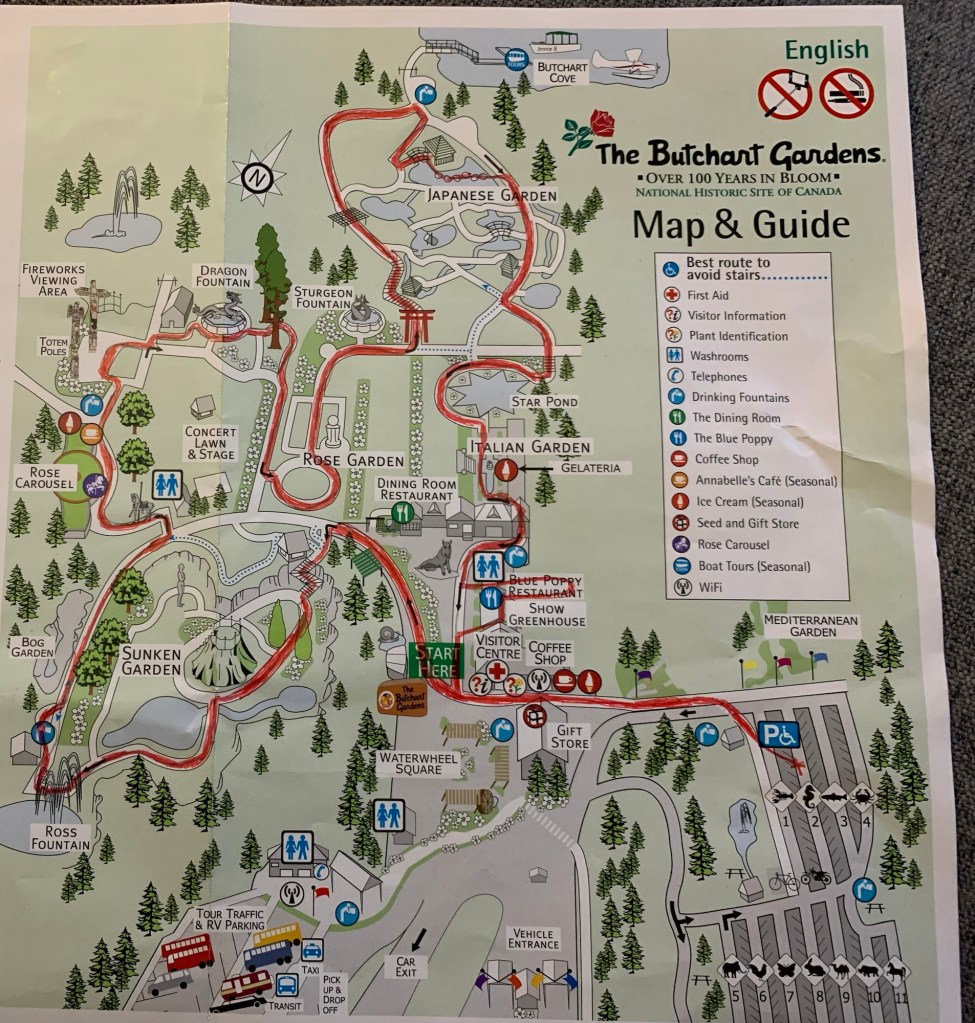 Map of the route we tookRyuu-chan and Dragon-kun posing in front of the Butchart Gardens sign
