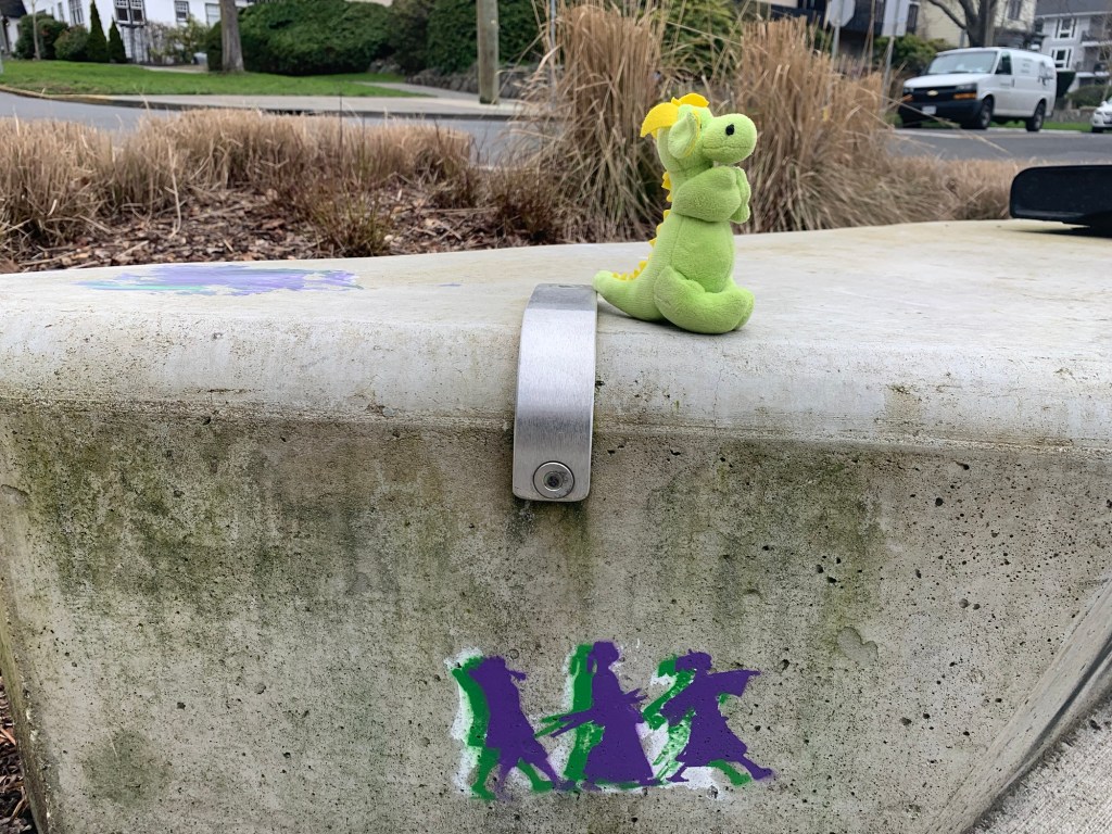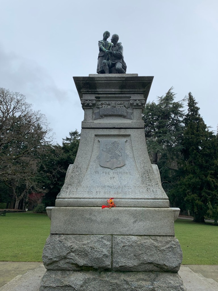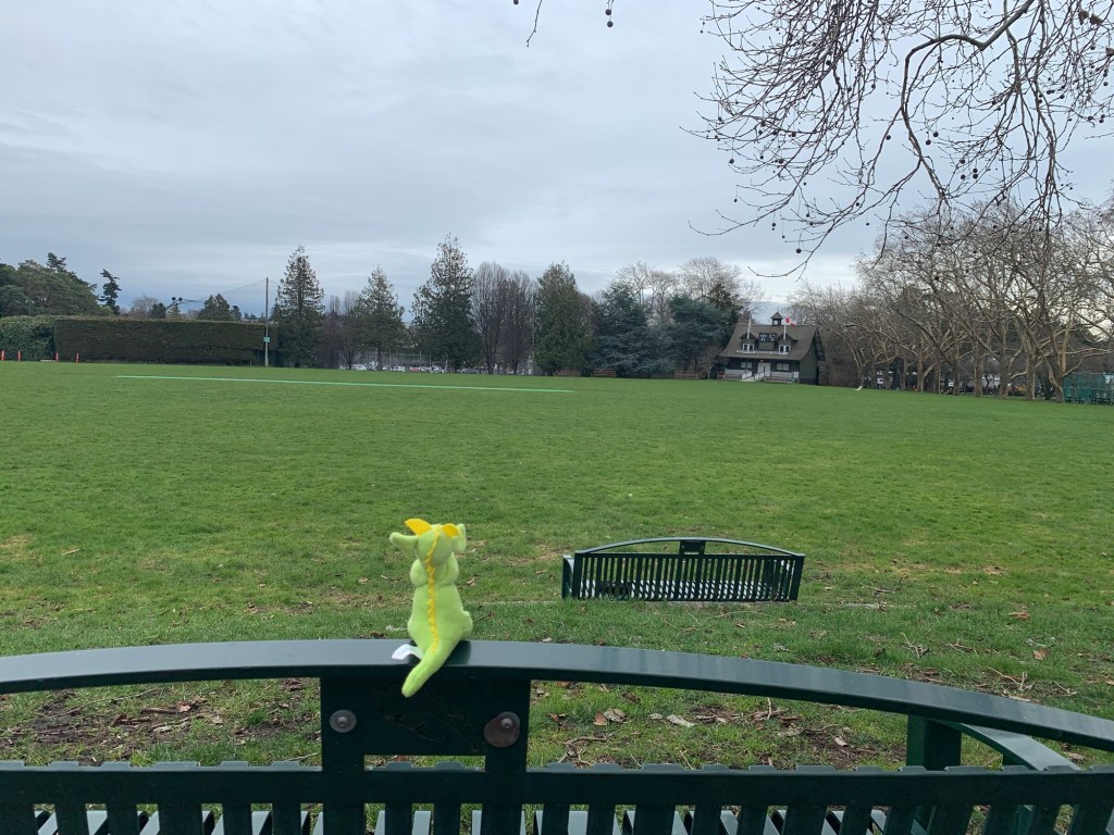 We (Dragon-kun, Ryuu-chan, and I) started our walk in Cook Street Village at Moka House (all walks must have coffee). Walked south, past the croquet lawns, the bowling green and the cricket pitch to the Robbie Burns monument (don’t ever say that Victoria, British Columbia was not colonized by the English and Scottish).