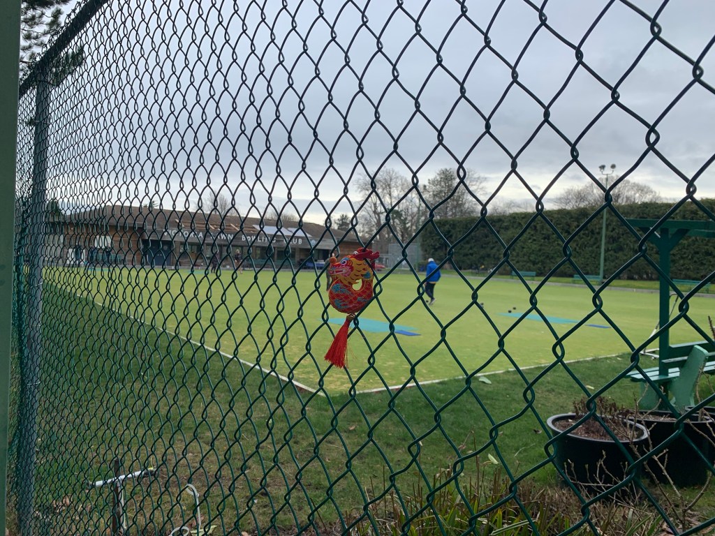 Dragon-kun posing in front of a plum tree in blossom Dragon-kun looking at the empty cricket fieldRyu-chan watching the lawn bowlers.
