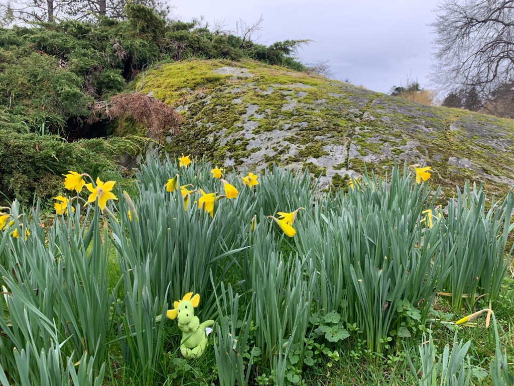 Dragon-kun amongst the daffodils Ryuu-chan trying to pose like the rampant lion on the crest. Robert Burns monument.