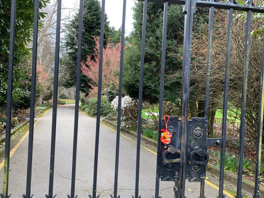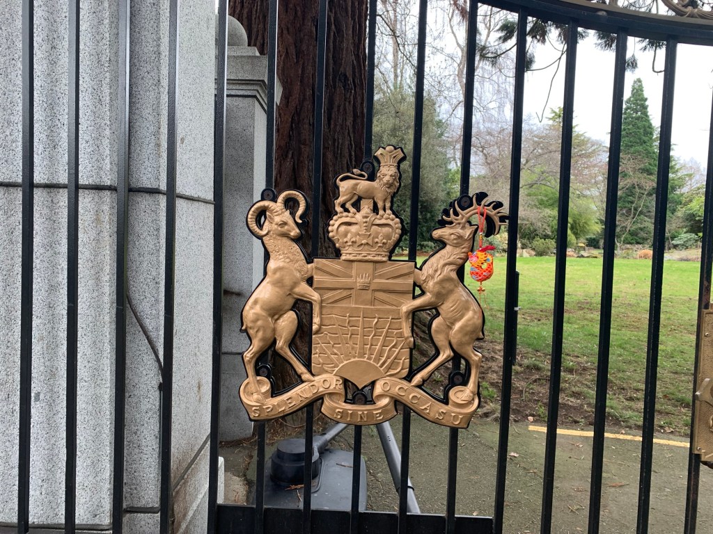Dragon-kun at a fairy door in front of the entrance of Government House One of the gates to Government House The only flowers we saw in bloomRyuu-chan on the crest of Government House