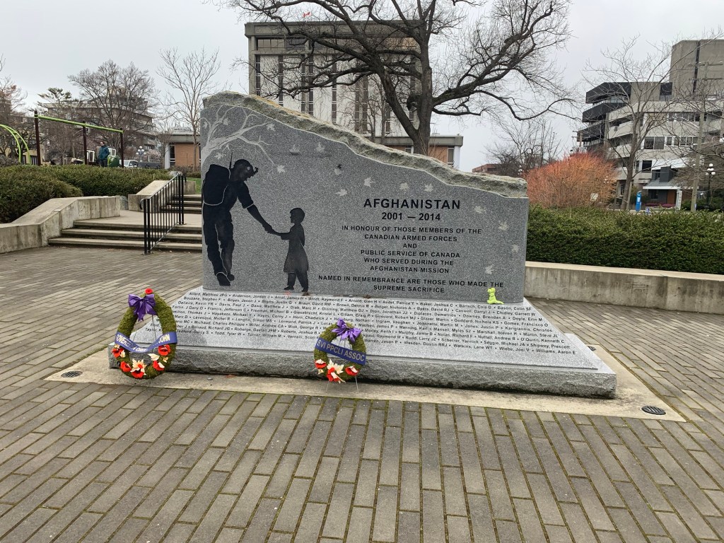 As we were passing the cenotaph, a woman was changing the wreaths. R., who is braver than me, asked the woman about it. The woman said she is from the Legion, and every Memorial Day they get more wreaths than they can display, so they spread the wreaths out throughout the year.