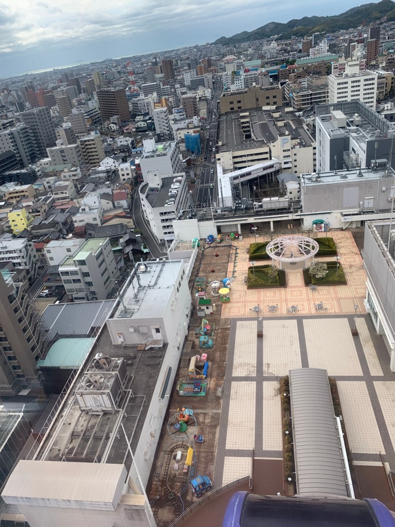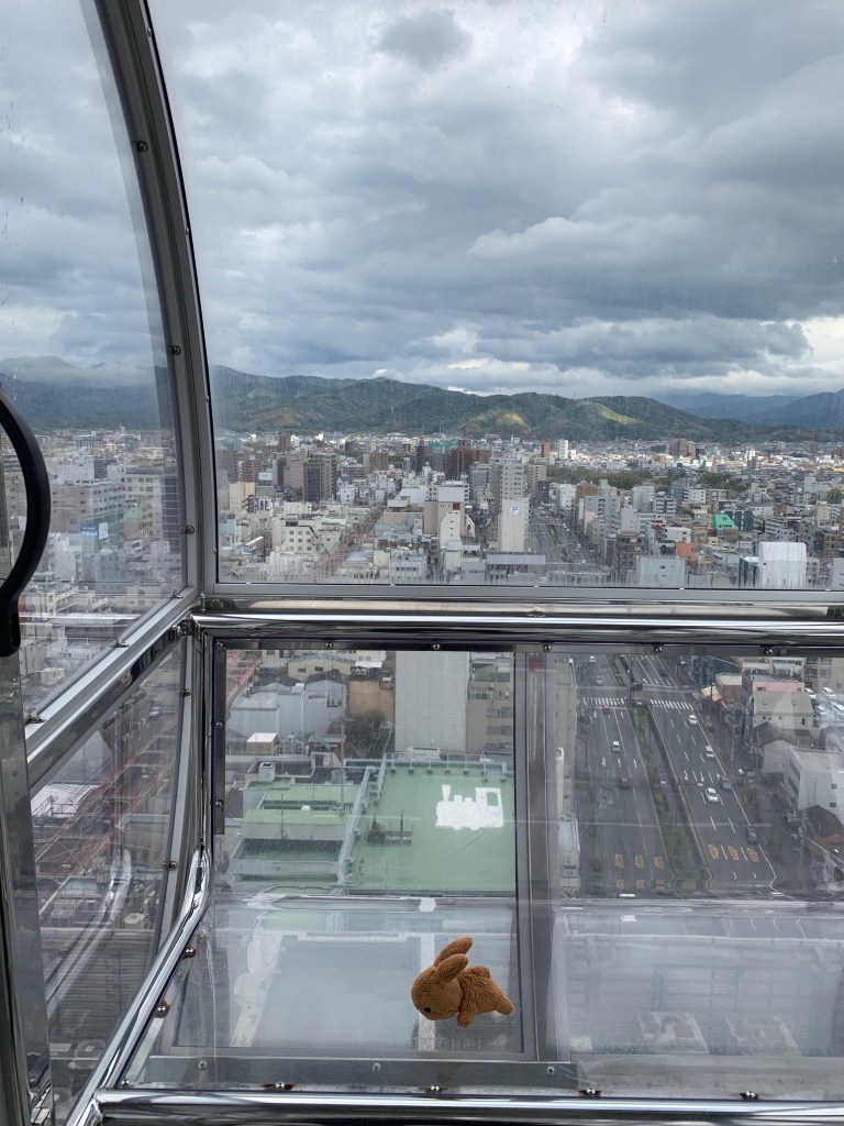 We then went to Iyotetsu department store and to the roof where there is a Ferris wheel. I didn’t understand the ticket machine and ended up buying a ticket for the clear car on the wheel… it was windy and besides Usagi-chan, I was the only one in the car. Not going to lie: it was a bit freaky.