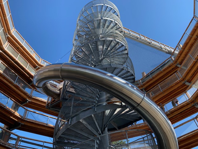 The day started out overcast and raining, but had cleared up around 11am and turned out to be a beautiful day. The Skywalk wasn’t too challenging to do as it is a circular wooden slope all the way to the top. The top there was a view of Mill Bay and a net that one can walk on and see all the way down. There is also a circular slide which runs down the center of the structure.